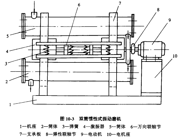 雙筒慣性式振動磨機的構造如圖10-3所示。它由機座1,筒體2,5,彈簧3,激振器4,萬向聯軸節6,支承板7,彈性聯軸節8和電動機9等組成。雙筒振動磨機的粉磨筒體為串聯方式上下布置,它們之間通過文承板7互連在一起,而支承板由彈簧3支承在機座I上。在支承板中部裝有激振器,激振器主動上裝有可調式偏心塊,激振器主鈾通過彈性聯軸節與電動機相連接。當電機通過彈性聯軸節帶動主軸轉動時,偏心塊產生離心力使筒體產生振動,物料從上筒體5的—端給入,在筒內受到粉磨介質的激烈振動沖擊磨剝作用粒度變小,并運動了筒體另一端,從排料門給入到筒體2進行粉磨,粉磨達到產品粒度要求p則從下筒體的誹料口排出。當產品粒度要求較粗時,也可采用兩個筒體并列布置的方式,被磨物料僅通過一個粉磨筒體,則可獲得兩倍的臺時產量。