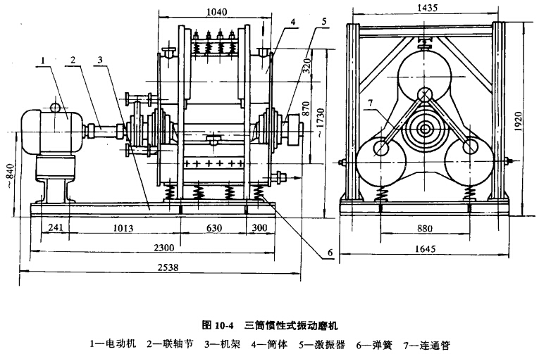 三筒慣性式振動磨機的構造如圖10-4所示。它由電機1、聯軸節2、機架3、筒體4、激振器5、彈簧6相連通管7等部分組成。振動磨機的筒體由三個圓筒和兩塊側板構成,通過兩側板將較大的上圓筒φ400xl040和較小的兩個下圓筒φ320xl040串聯在一起,而兩個下圓筒彼此互成并聯,各圓筒內壁上均鈕有襯板,以防筒壁磨損。激振器主要由偏心軸、可調式偏心塊、鑄鋼軸承座、雙列調心滾子軸承和迷宮式密封環等組成。電機1通過彈性聯軸節2帶動激振器5的偏心軸及安裝在軸兩側的偏心塊旋轉,產生離心力,從而使坐落在彈簧上的筒體產生高頻小幅振動。物料和水不斷地從上圓筒的給料口加入,物料在筒內粉磨介質的頻繁沖擊和研磨作用下被磨細,完成一段粉磨,而后經過排料連通管分別流入下部兩個小圓筒內進行第二段粉磨,粉磨好的合格產品從小圓筒的排料口排出。整個粉磨作業為連續作業。